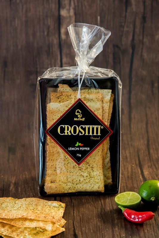 Massinha Crostiti leva em seu peculiar sabor diversos tipos de pimentas como também leves toques de raspas de limão.