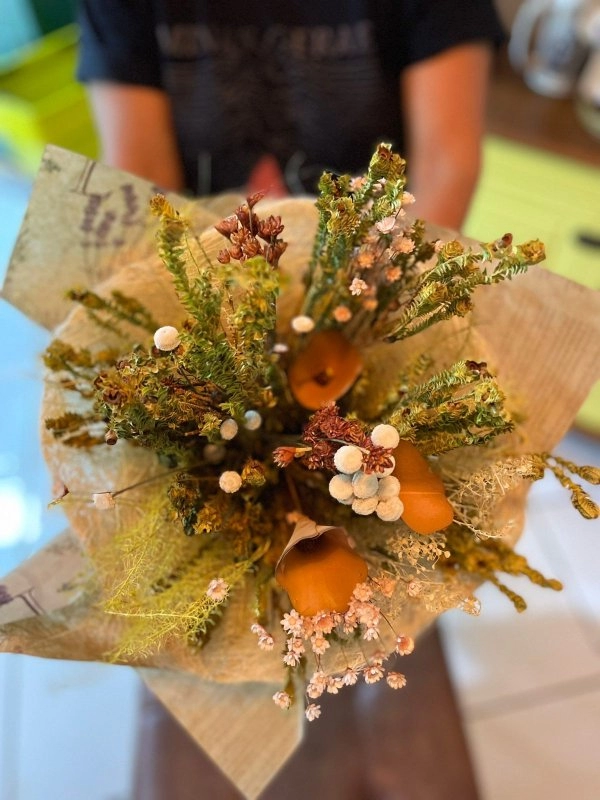 Ramalhete: flores secas com qualidade premium, envolta por um suporte para arranjo e embrulhamos em um papel especial com excelente gramatura.