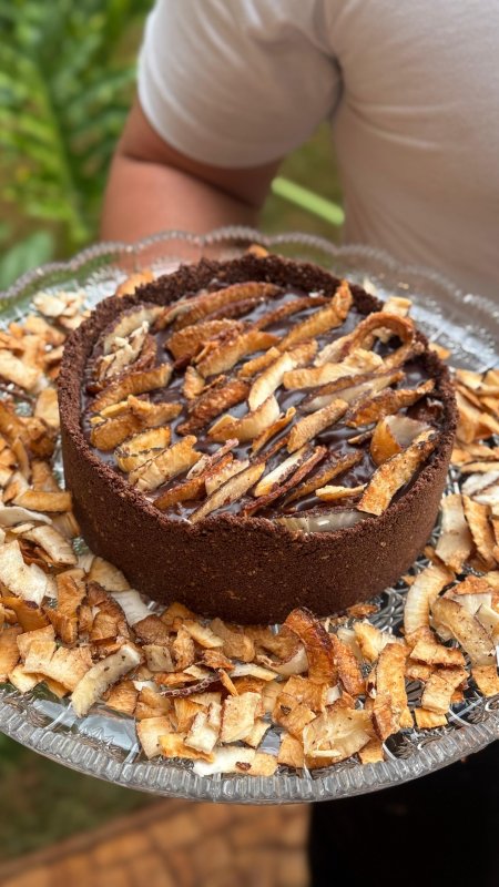 Torta com base de bolacha de cacau, recheada com cocada cremosa e ganache de chocolate maio amargo, finalizada com fita de coco. Um sobremesa para até 6 pessoas.