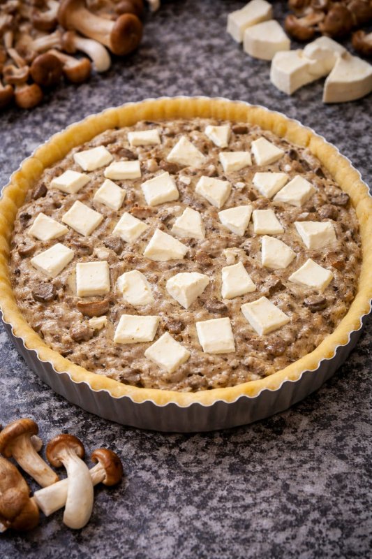 Deliciosa torta de queijo Brie e cogumelos na massa podre. Produto artesanal elaborado por uma produtora de Passos/MG. 900g aprox.